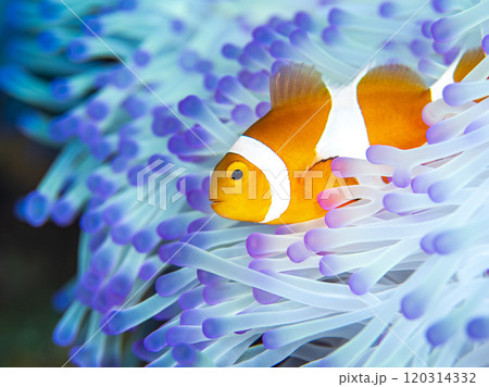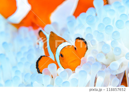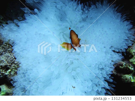 透き通る真っ白なイソギンチャクの中のクマノミ
