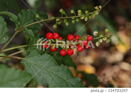 自然 植物 ジュズサンゴ、南米原産の花。秋から冬に艶々の赤い実をつけます