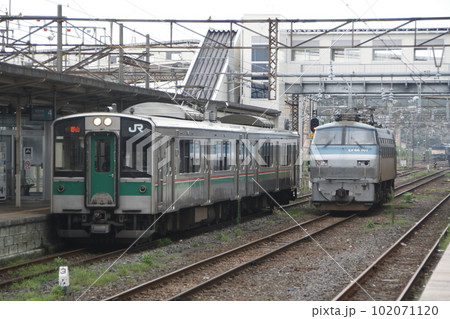 新白河駅を通過する貨物列車と停車中の黒磯行東北本線E531系電車