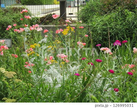 シモツケの白い花ゴテチアの桃色の花ムギナデシコの青い花シロタエギクの黄色い花