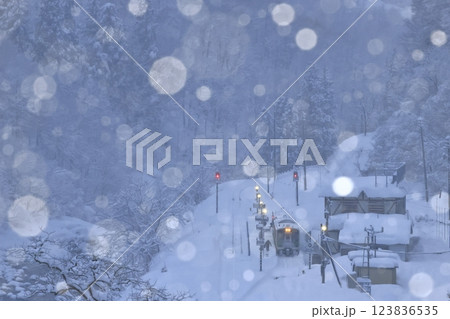雪降る冬の大白川駅(只見線)