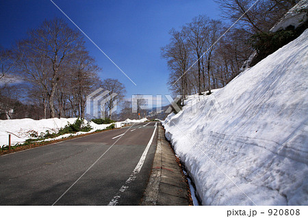 春の白布峠の森林と残雪