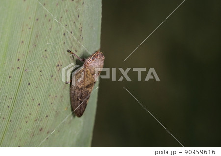 生き物 昆虫 モンキアワフキ、体長十二~三ミリ。淡褐色の翅に目につかないほど小さな白斑が一対