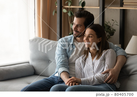 Loving couple relax on sofa cuddling daydreaming looking into distance