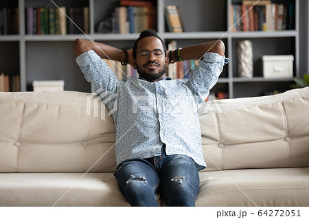 Smiling man sitting relaxing on cozy couch, visualizing future
