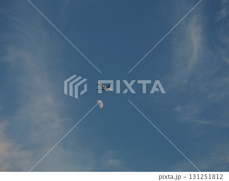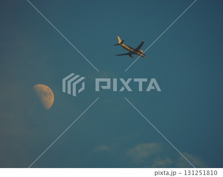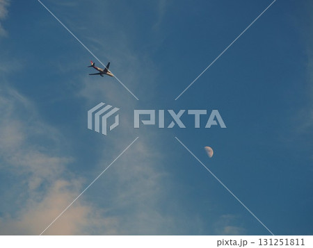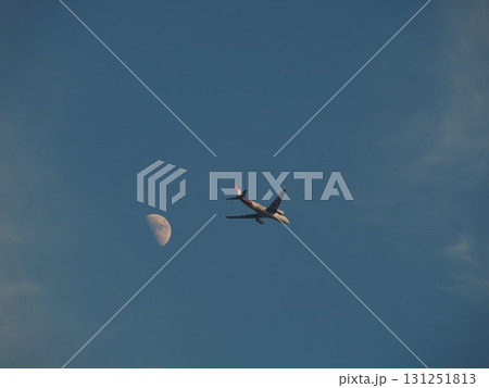 青空に浮かぶ白い月を背景に飛ぶ旅客機