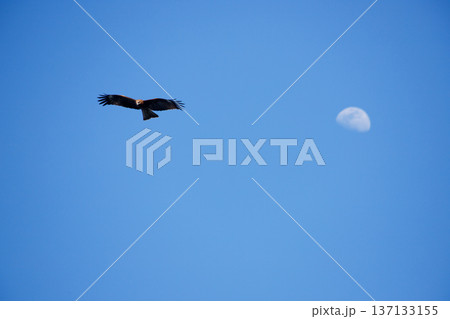 青空を飛ぶトビと薄白の半月