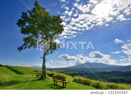 夏の北海道美瑛町の景勝地 セブンスターの木と白樺並木