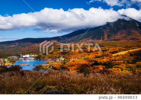 秋の長野県の白樺湖展望台付近から蓼科山,白樺湖方面の眺望