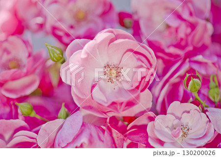 薔薇園にピンクと白色のバラの花が咲いています。薔薇の花束のようです。