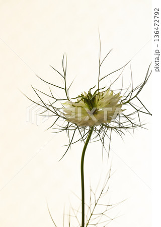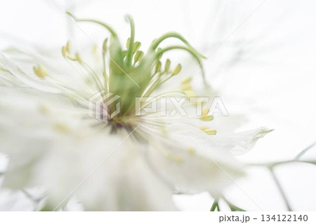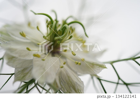 ニゲラの花をクローズアップした繊細なマクロ写真|白背景に映えるニゲラの繊細な花姿
