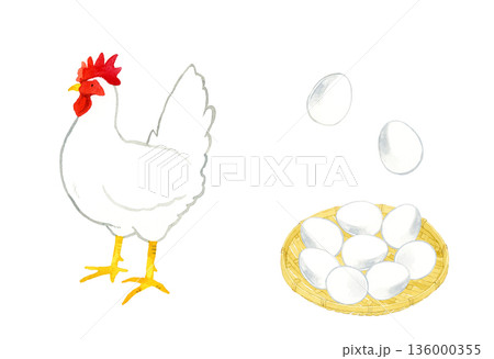 白色のニワトリと鶏卵のセット 手描き水彩イラスト素材