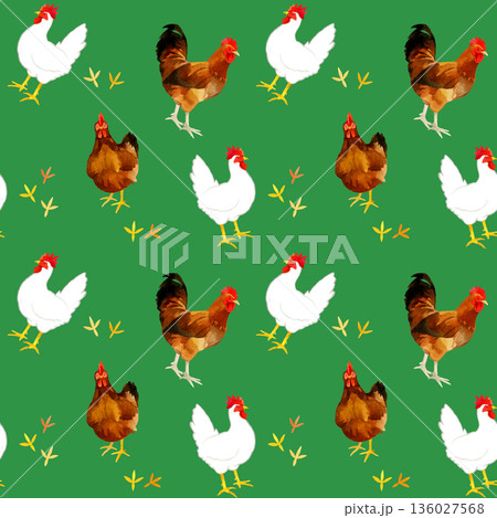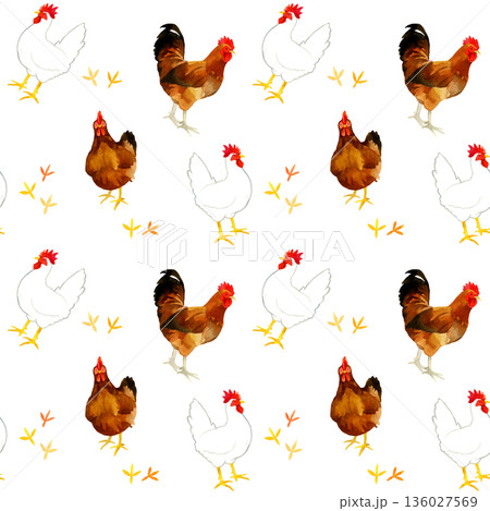 3種類のニワトリのシームレスパターン 鳥の手描き水彩イラスト背景素材