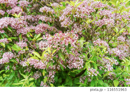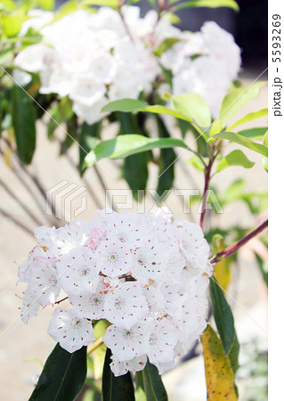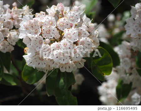 白い花びらの可愛い花のたくさん集まるカルミアの花の咲く花木の風景