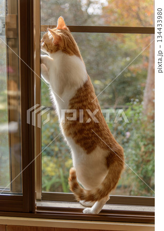 窓際に座る茶トラ色の猫【秋色】別荘