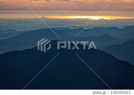 大菩薩連嶺・白谷ノ丸から見る朝の横浜方面の町並みと光る東京湾