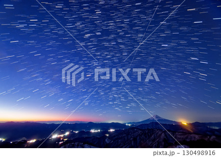 山梨県大月市の白谷ノ丸より大月市の光と空の星の向こうに富士山