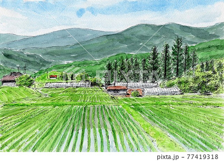 青空と花が咲く高原の風景、水彩画風。AI生成素材。