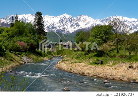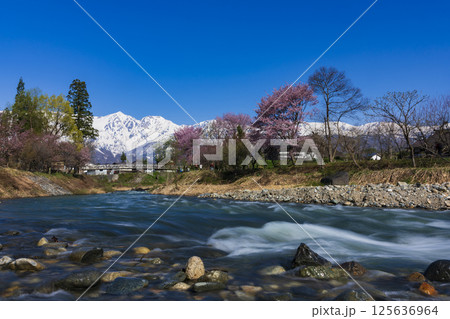 4月の白馬村 春の白馬村の風景 冠雪の北アルプス 信州の風景