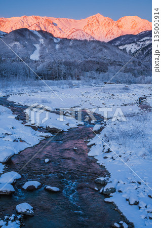 白馬三山モルゲンロートと松川【白馬大橋より撮影】