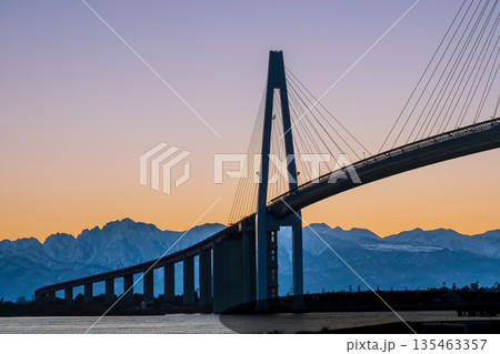 夜明けの海王丸パークから朝焼けの立山連峰を背景に新湊大橋と海王丸
