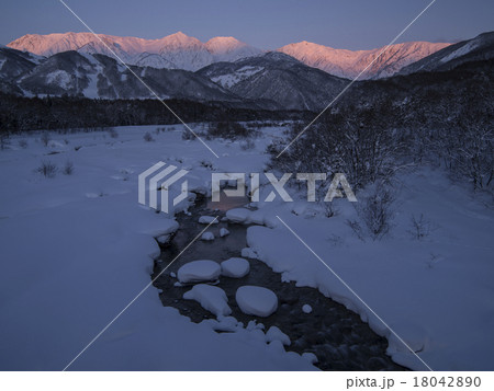 モルゲンロートに輝く冬の白馬三山と松川(白馬大橋より)