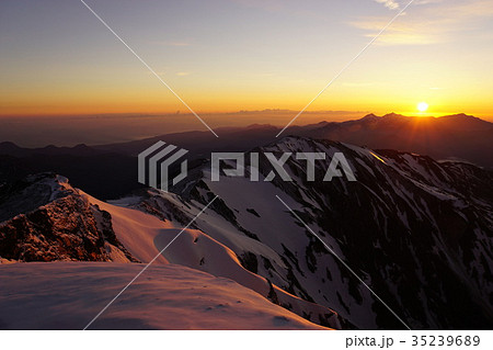 白馬山岳の朝焼けの山並み 快晴風景素材