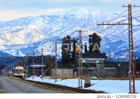 月岡駅に入線する富山地方鉄道に雪に覆われた立山連峰の威容が迫る
