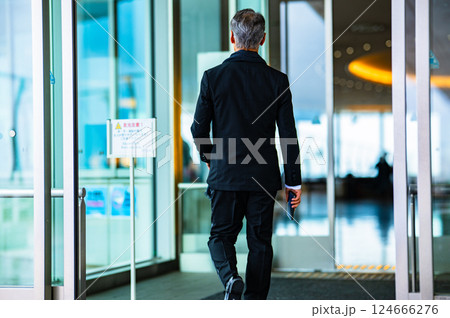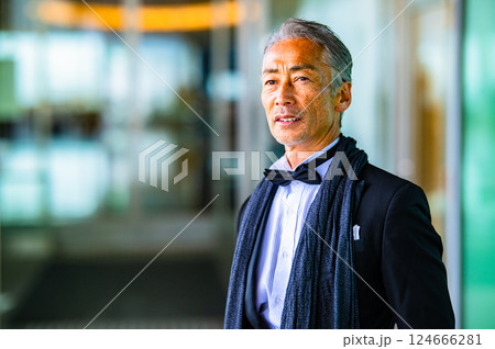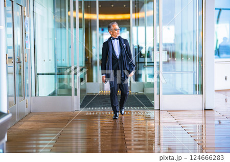 施設の自動ドアから屋外に出てくるタキシードを着た紳士