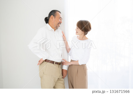 仲睦まじくソファーに座っているシニア夫婦の写真