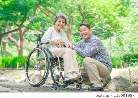 シニア女性 若い女性 笑顔 仲良し 車イス