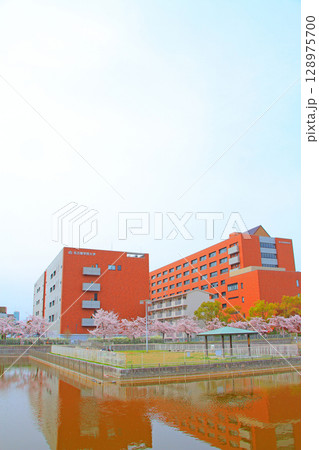 愛知県名古屋市、名古屋学院大学と満開の桜の風景