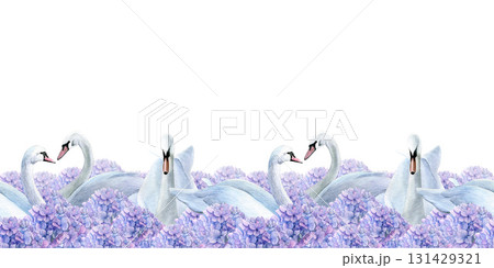 Seamless border with swans and purple hydrangea. Watercolor illustration of floating white birds in summer flowers on a white background. Good for postcards, recipes, menu, invitations, greeting cards