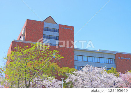 愛知県名古屋市、名古屋学院大学と満開の桜の風景