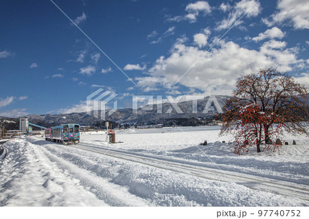満開の桜 残雪 フラワー長井線 山形鉄道