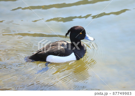 バードウォッチングで冬の公園の水辺で見られる白黒のパンダのような美しいカモ、ミコアイサ