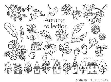 ハロウィンや金木犀など秋の行事や素材のイラストのセット モノクロバージョン