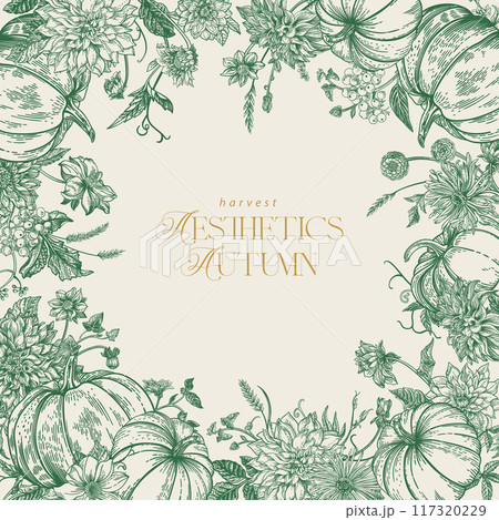 Vintage floral frame. Pumpkins, dahlias, zinnias, asters, dogwood berries, maiden grapes. Harvest festival. Vector botanical illustration. Engraving style. Green.