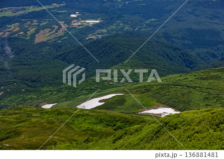 鳥海山・外輪山から見る心字雪の雪渓と湯ノ台登山口