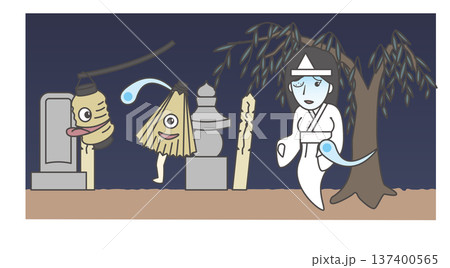 夜の墓場と日本の妖怪・幽霊イラストセット(唐傘おばけ・提灯おばけ・人魂・ホラー)