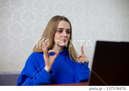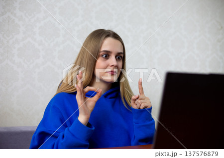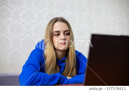 Disappointed blonde girl watches boring football match with 0-0 score. She frowns and shrugs shoulders, unhappy with dull game. Negative reaction to live World Cup stream