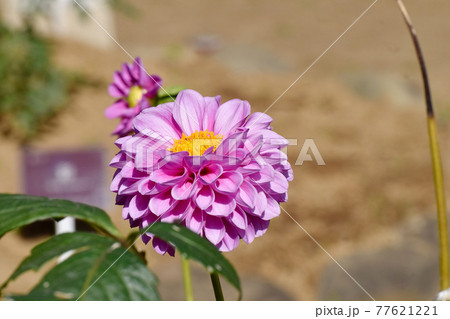 調布市深大寺元町の植物園に咲く紫色と白のダリア(恋空)の花