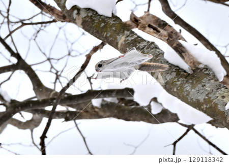 北海道の冬の公園で日中に雪の積もった木々の間を空を飛ぶ(跳ぶ)エゾモモンガ