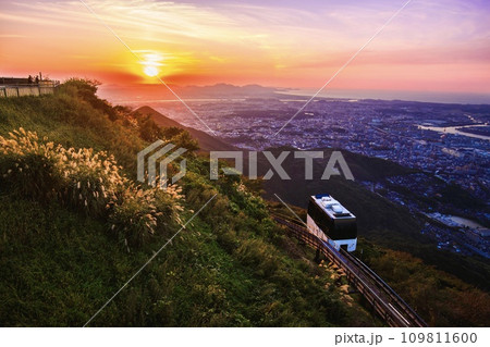 北九州市、皿倉山展望台から眺める夕焼けの空とスロープカー