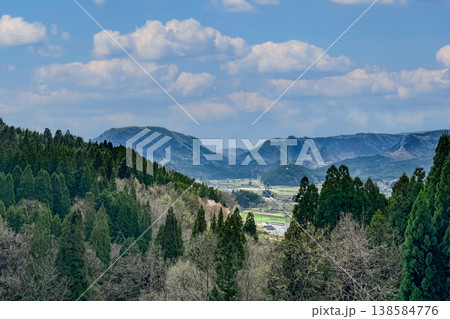 九州道玖珠パーキングエリアからの玖珠盆地と伐株山