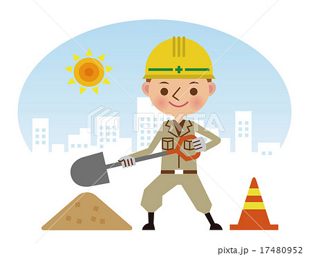 シャベルを持って働く作業員(昼間背景)