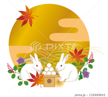 赤 十五夜 中秋の名月 お月見をするうさぎ コピースペース有り