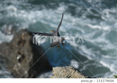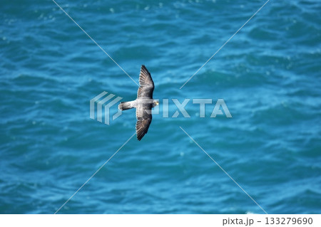 秋の伊良湖岬 日出園地の海岸を飛翔するチゴハヤブサ