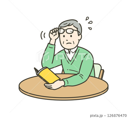 老眼鏡の度が合わず本が見づらく困っている高齢男性イラスト