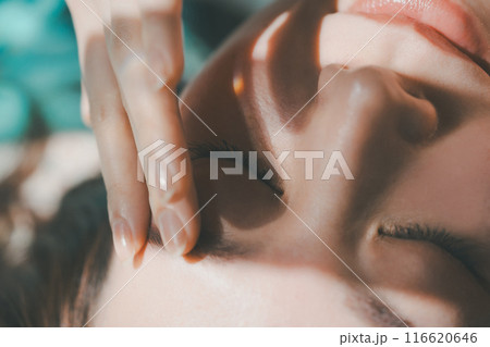 目を閉じた赤ら顔の女性 肌の悩み(湿疹、アトピー)